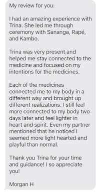 āTrina is hands down the most gifted healer Iāve ever met. I come from a long line of healers, and she is truly amazing. Sheāll give you tough love and be honest with you, but sheāll also be gentle and just hold you like a baby when you need it. Her readings are always spot on, and as a shaman she does miracle work. My first kambo experience was with her and she was very knowledgeable about the medicine and proper protocol, and she was extremely supportive throughout the whole process. Trina is the total package- shaman, healer, psychic, medium, and friend. She radiates Christ energy and I have felt the presence of deceased loved ones through her touch. Whether you consult her to work with plant medicines or even just for a Celtic Cross tarot reading, you will come away from the experience changed for the better. ā- @madibcarr